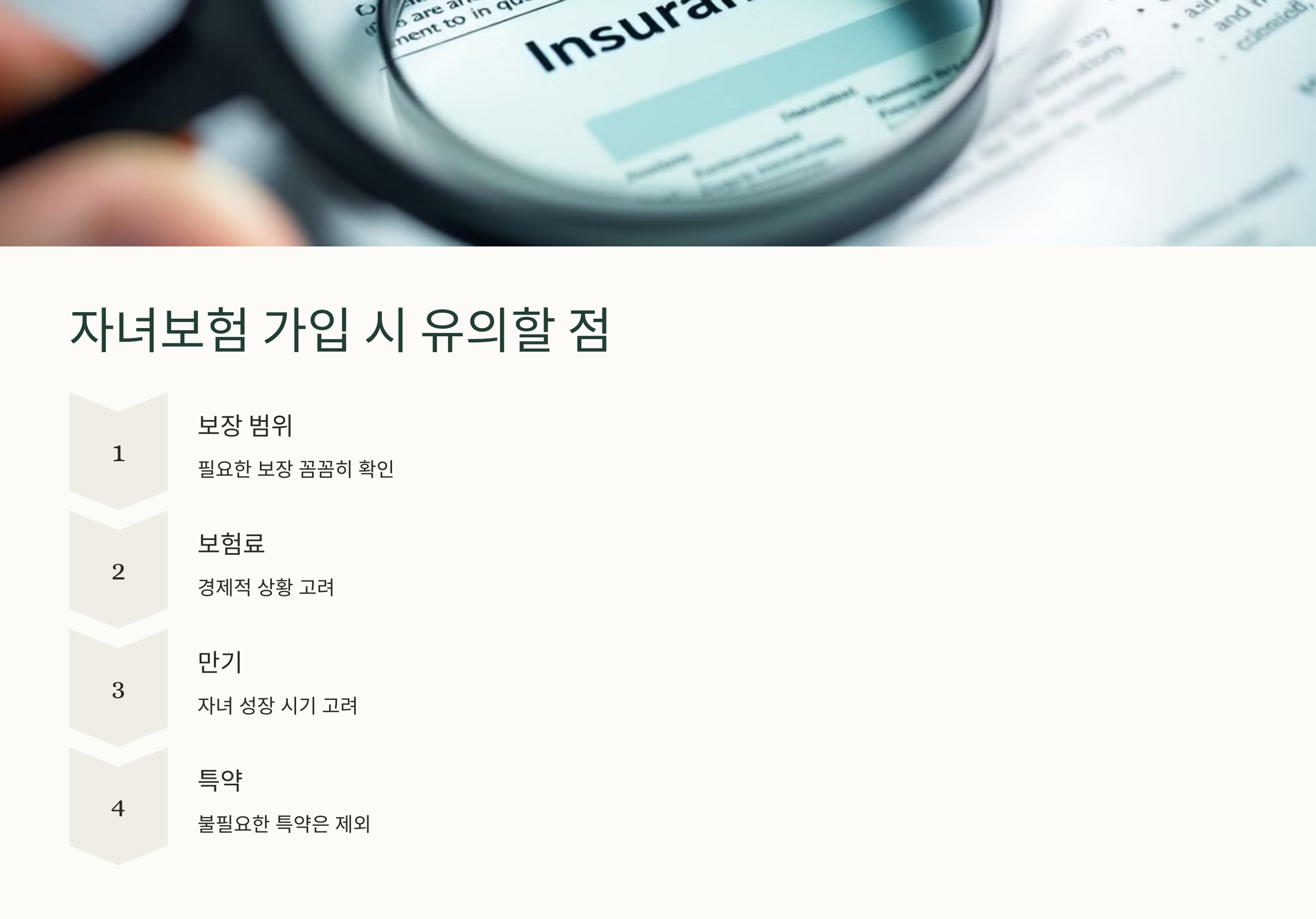 자녀보험은 **가입 후 오랫동안 유지해야 하는 상품**이므로, 가입 전에 꼭 체크해야 할 사항이 있어요.