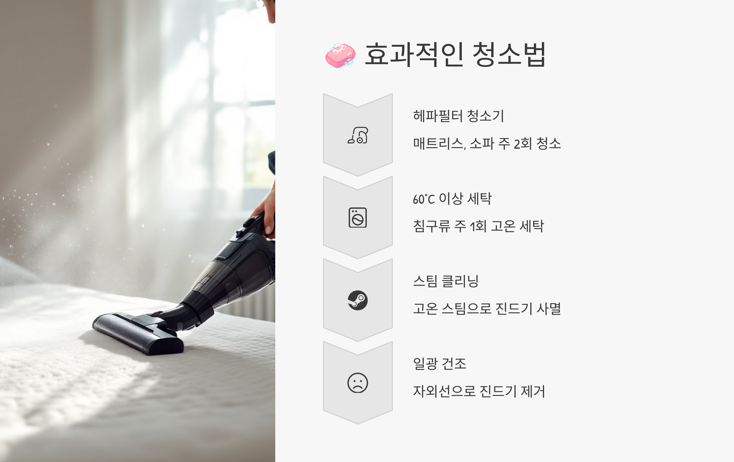 그래서 효과적인 청소를 위해선 **전략이 필요해요.** 무작정 청소기를 돌리는 게 아니라, 진드기의 생태를 이해하고 그들이 싫어하는 환경을 만들어주는 방식으로 접근해야 해요.