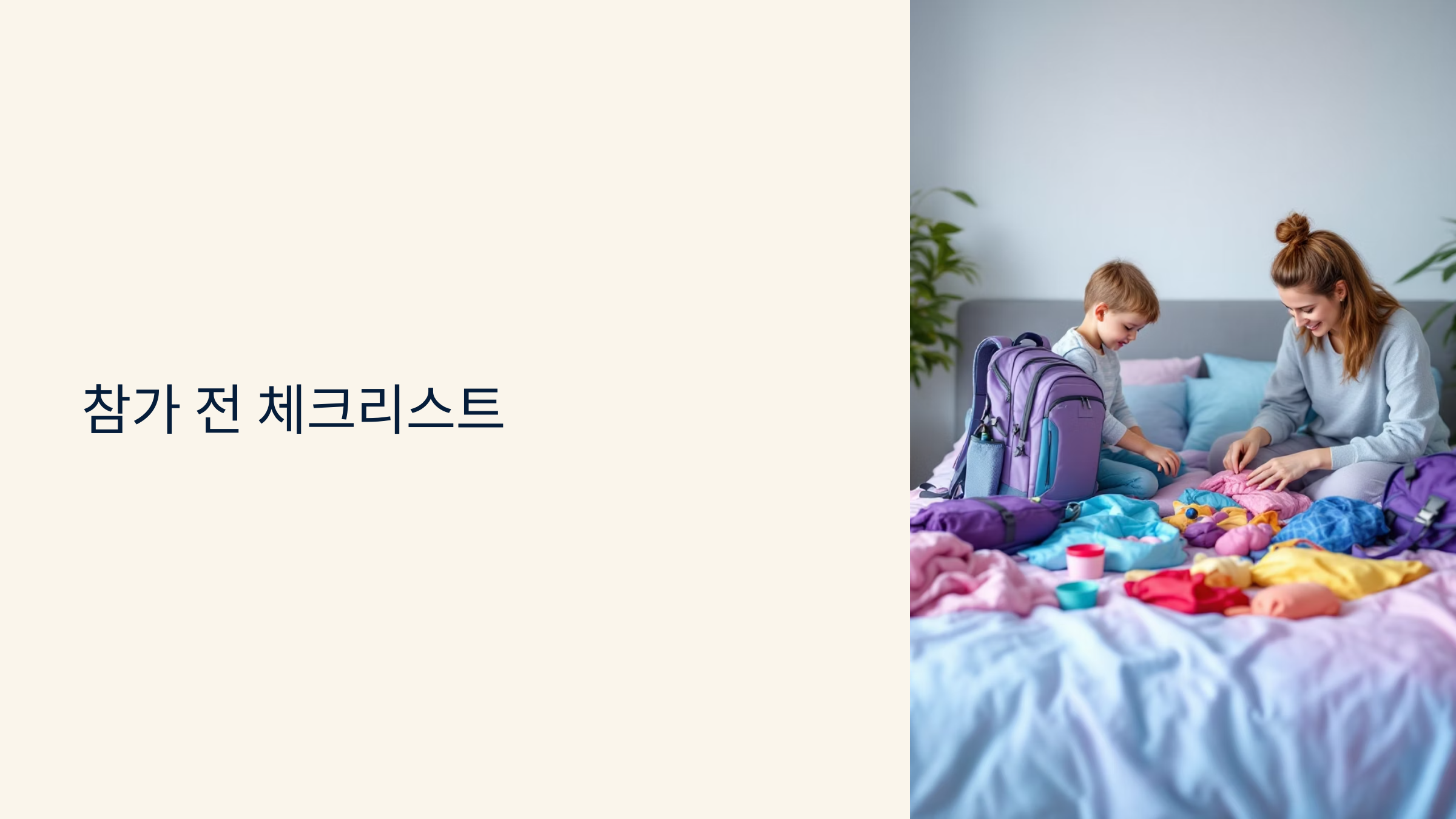 이렇게 테마에 따라 캠프를 고르면 아이가 더 즐겁고 몰입도 높은 시간을 보낼 수 있어요. 다음은 캠프를 떠나기 전에 꼭 알아야 할 ‘참가 전 체크리스트’를 확인해볼게요! 🎒📋