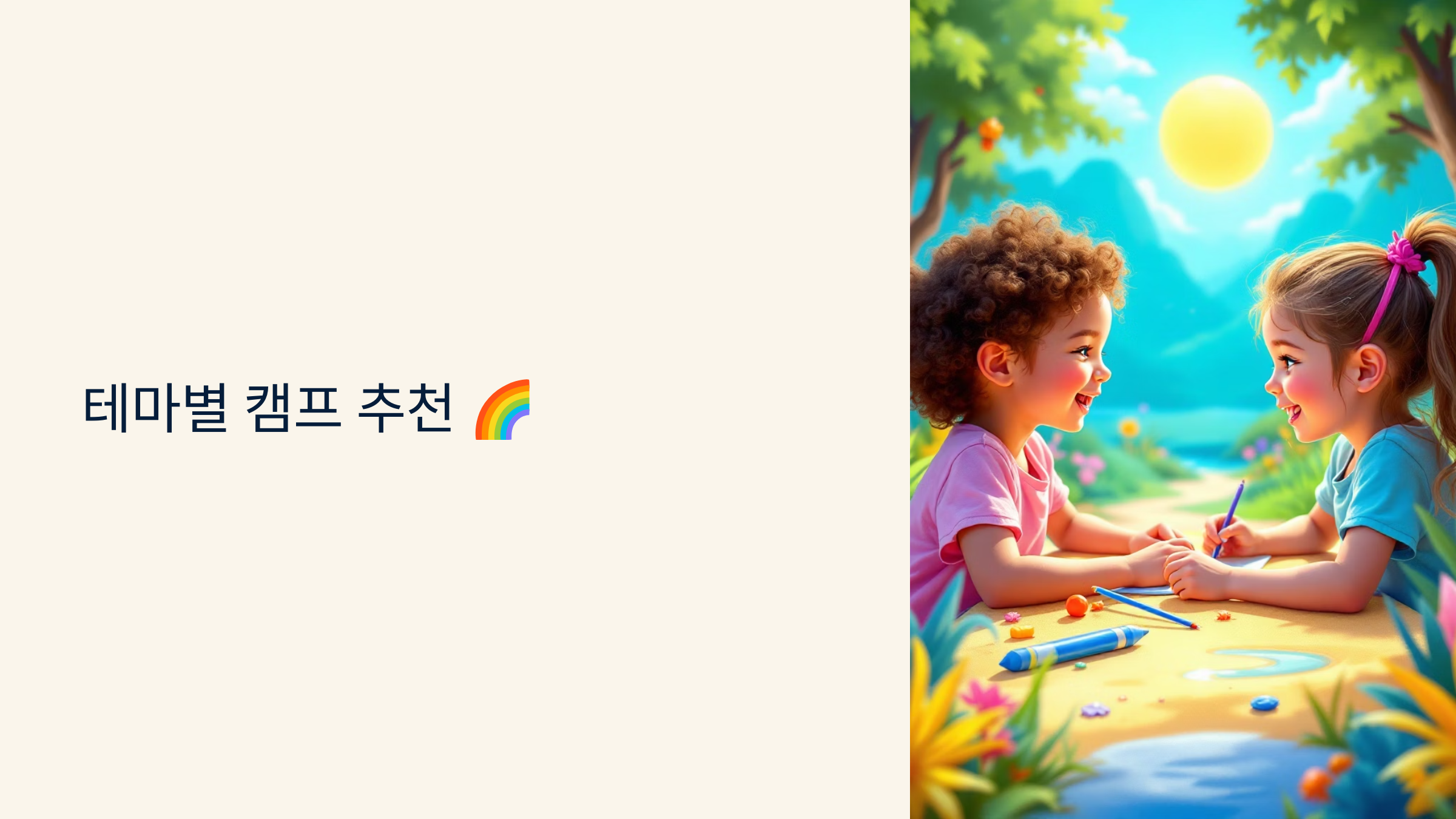 모든 아이가 똑같은 캠프를 좋아하지는 않아요. 어떤 아이는 자연을 좋아하고, 어떤 아이는 실험을 좋아하죠. 그래서 아이의 성향에 따라 테마별 캠프를 선택하는 게 중요해요. 여기선 인기 있는 다섯 가지 테마별로 알맞은 캠프를 소개할게요! 🎨🔍