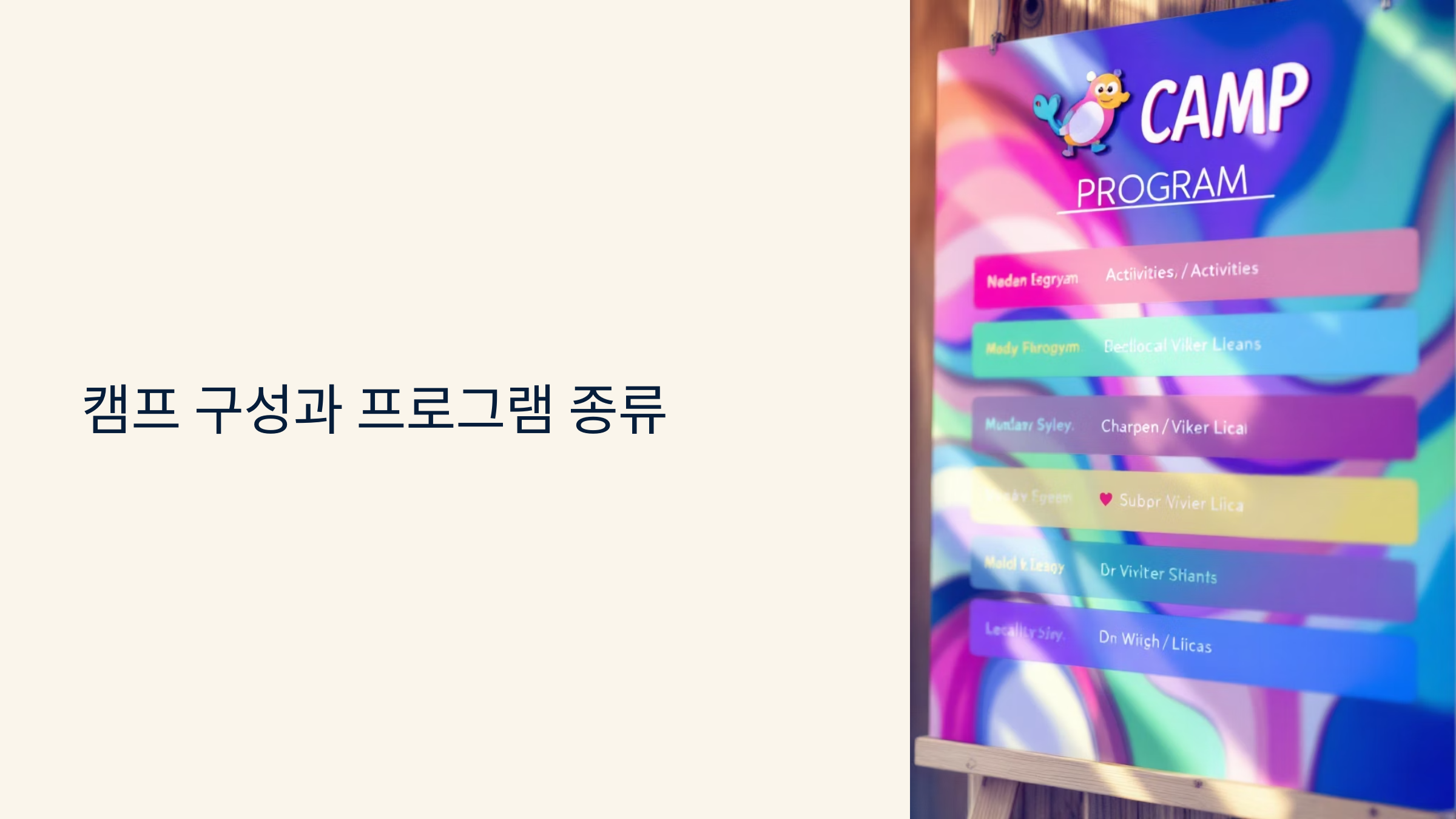다음은 캠프가 어떻게 구성되어 있는지, 프로그램에는 어떤 것들이 포함되어 있는지 알려드릴게요! 🎒👣