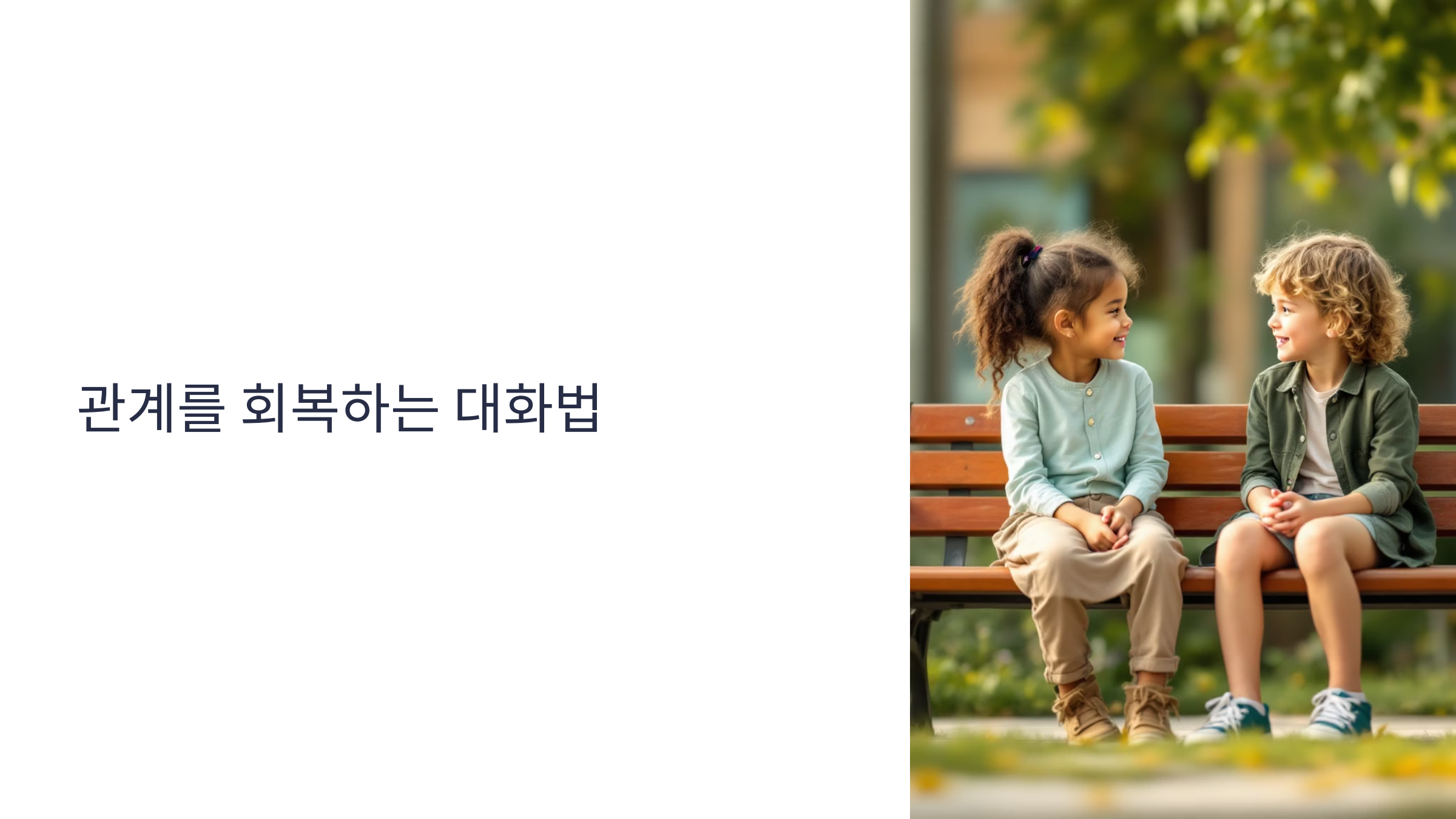 아이들이 친구와 갈등을 겪은 후 다시 관계를 회복하는 것은 결코 쉬운 일이 아니에요. 용서를 구하거나 마음을 전하는 일은 어른에게도 어렵지만, 말로 감정을 표현하는 데 익숙하지 않은 초등학생에게는 더더욱 어려운 일이에요. 그래서 친구 관계 회복을 위한 ‘건강한 대화법’을 익히는 것이 정말 중요해요.