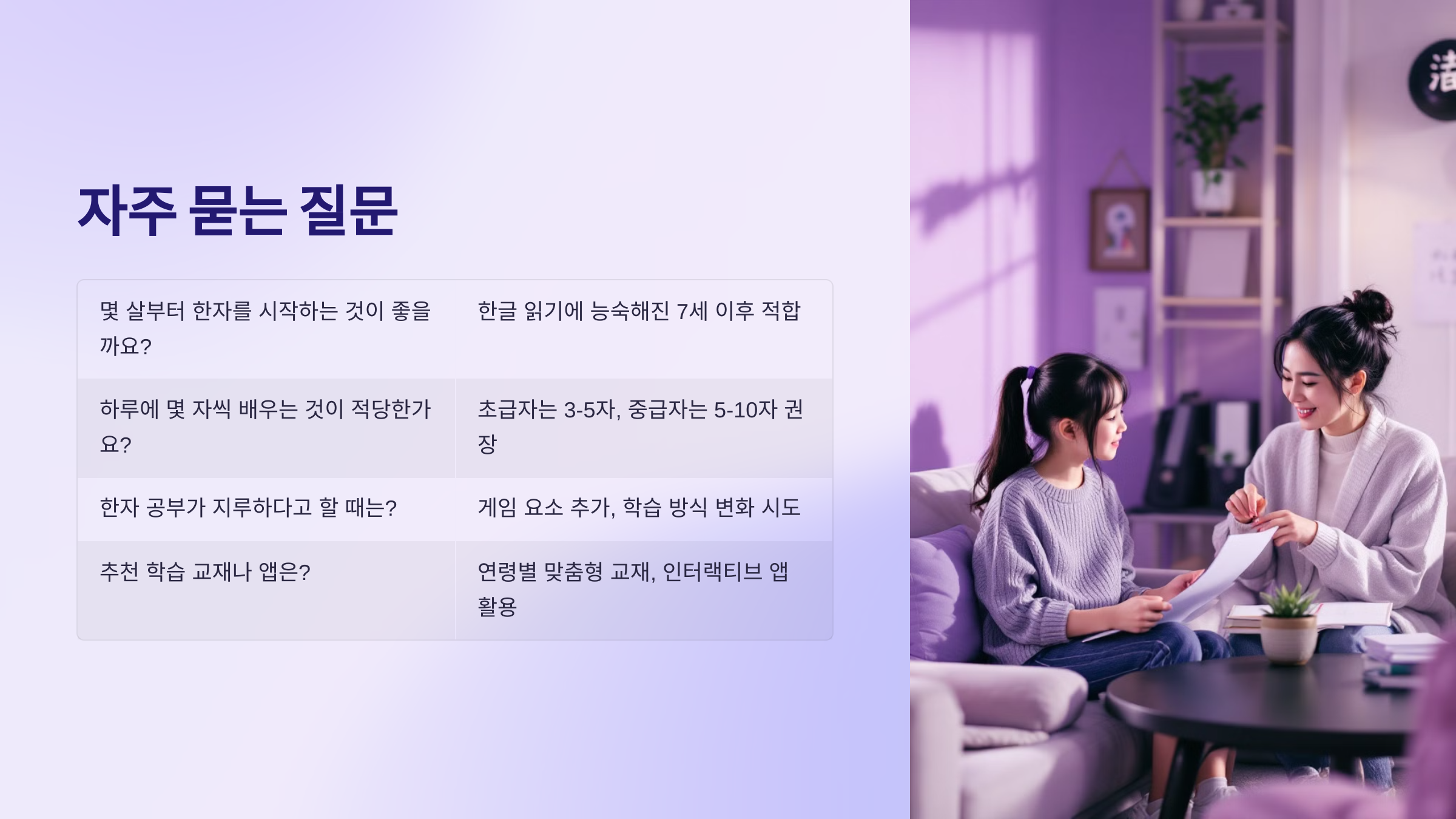 A2. 1~2학년 때 기초 한자 노출부터 시작해 3학년 이후 본격 학습으로 연결하는 걸 추천해요.