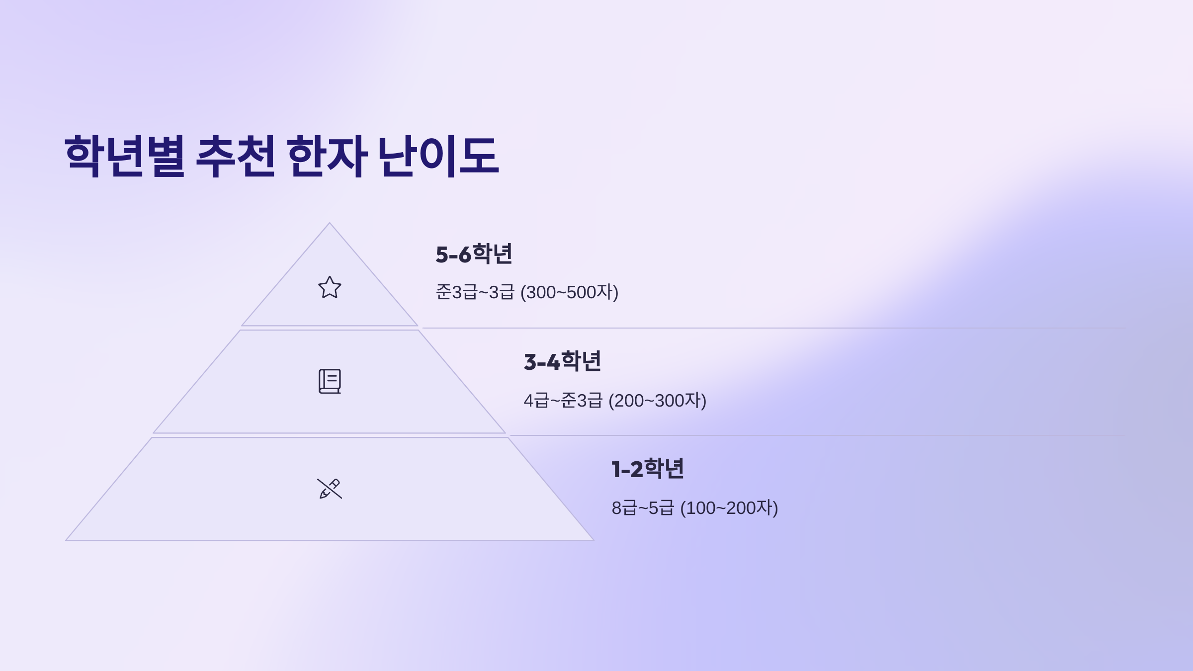 3~4학년은 기본 부수와 자주 쓰이는 4급 한자 위주로, 5~6학년은 중등 교과서에 나오는 어휘와 연결된 3급 수준 한자까지 도전할 수 있어요. ‘관찰(觀察)’, ‘조사(調査)’처럼 교과 단어를 함께 익히면 효과는 두 배!