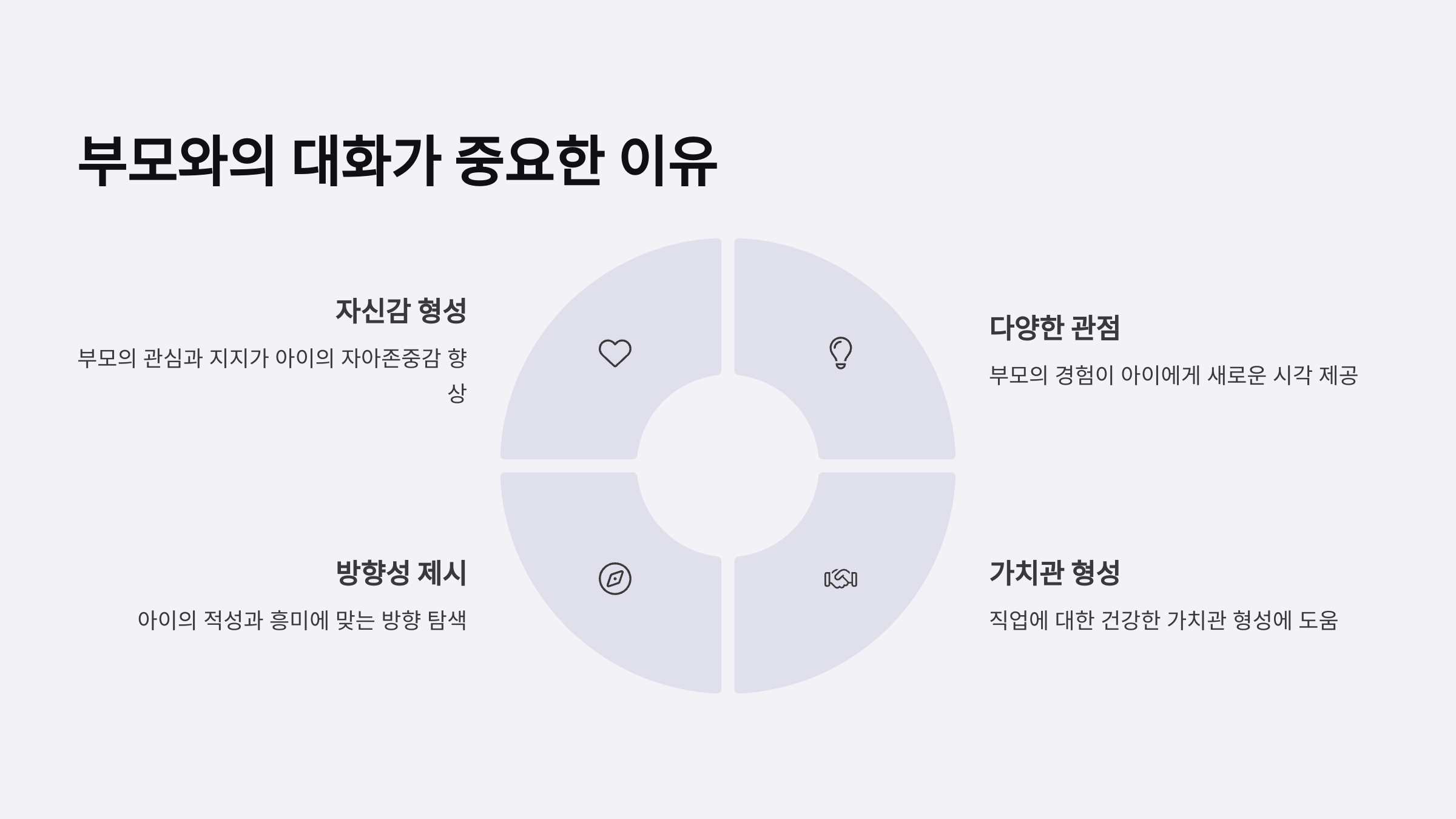 진로 교육에서 부모는 가장 중요한 안내자예요. 아이가 자신의 관심사와 강점을 발견하는 데 있어, 부모와의 대화가 큰 역할을 해요. 진로에 대해 무겁게 묻기보다는 일상 속에서 자연스럽게 이야기하는 것이 더 효과적이에요.