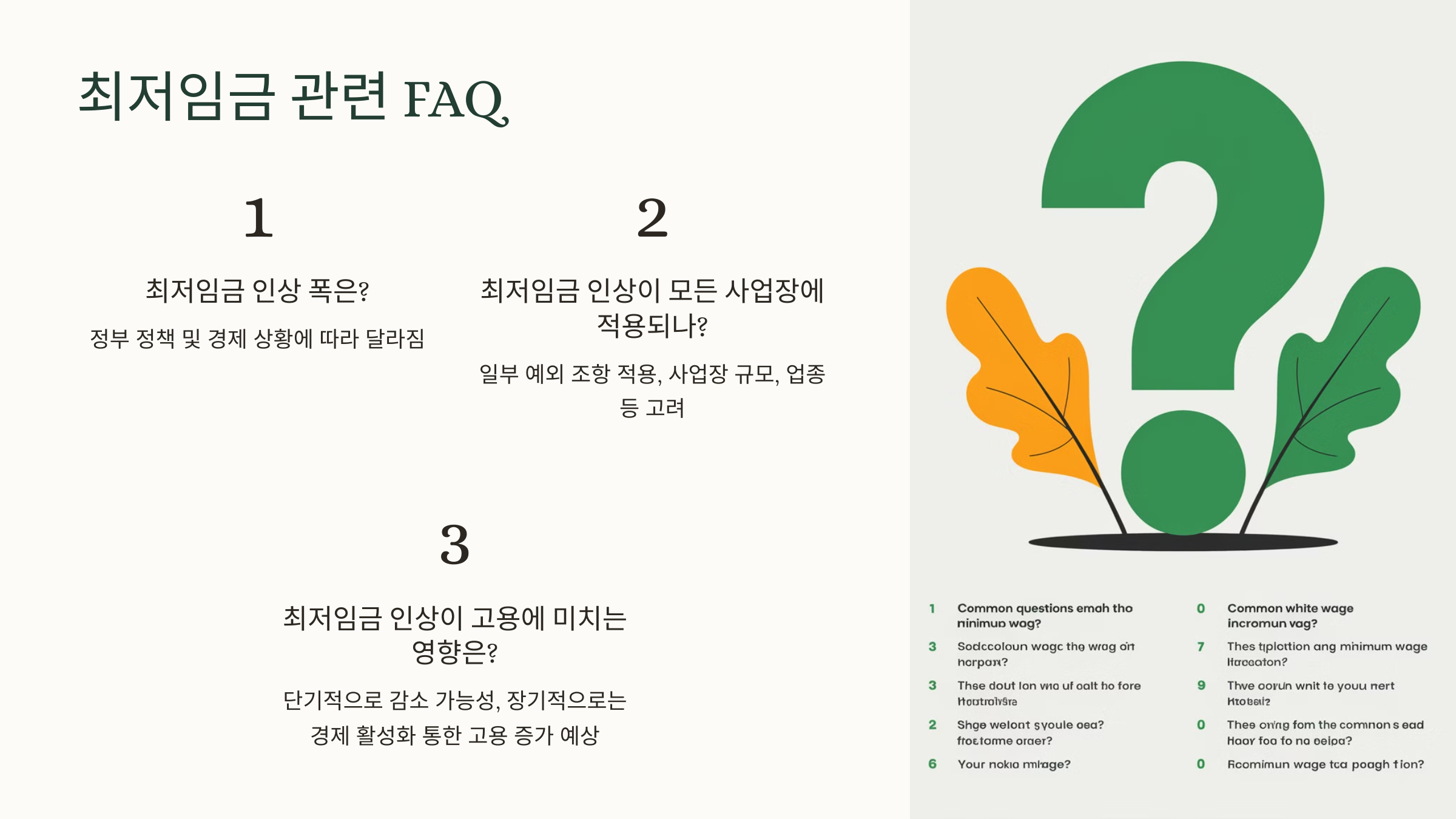 결국 **최저임금 인상은 신중한 접근이 필요하며, 노동자와 기업, 정부 간의 균형 잡힌 정책이 중요해요**. 그렇다면, 최저임금과 관련해 자주 묻는 질문(FAQ)을 정리해볼까요? ❓