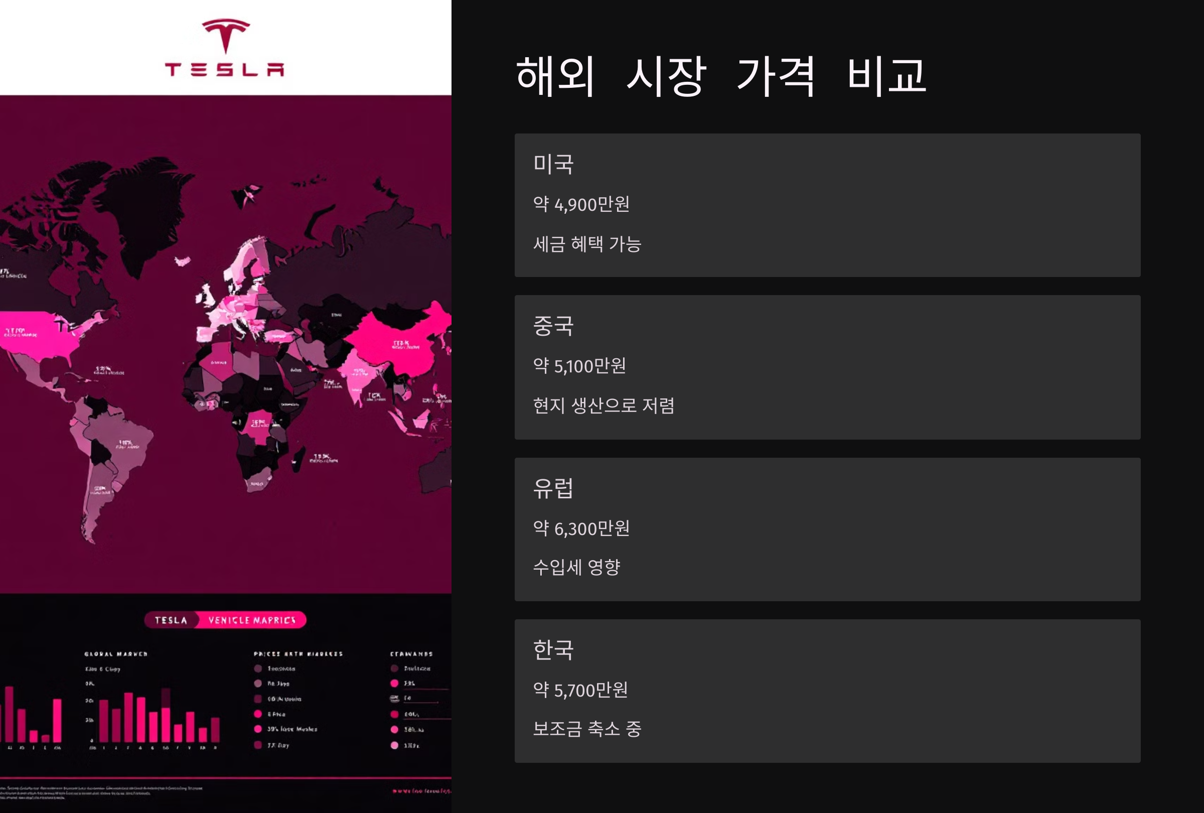 A4. 한국은 수입차 관세, 부가세, 물류비 등이 포함되면서 가격이 높아져요. 반면, 미국은 테슬라 본사가 위치한 나라로 현지 생산이 가능해 가격이 낮아요.