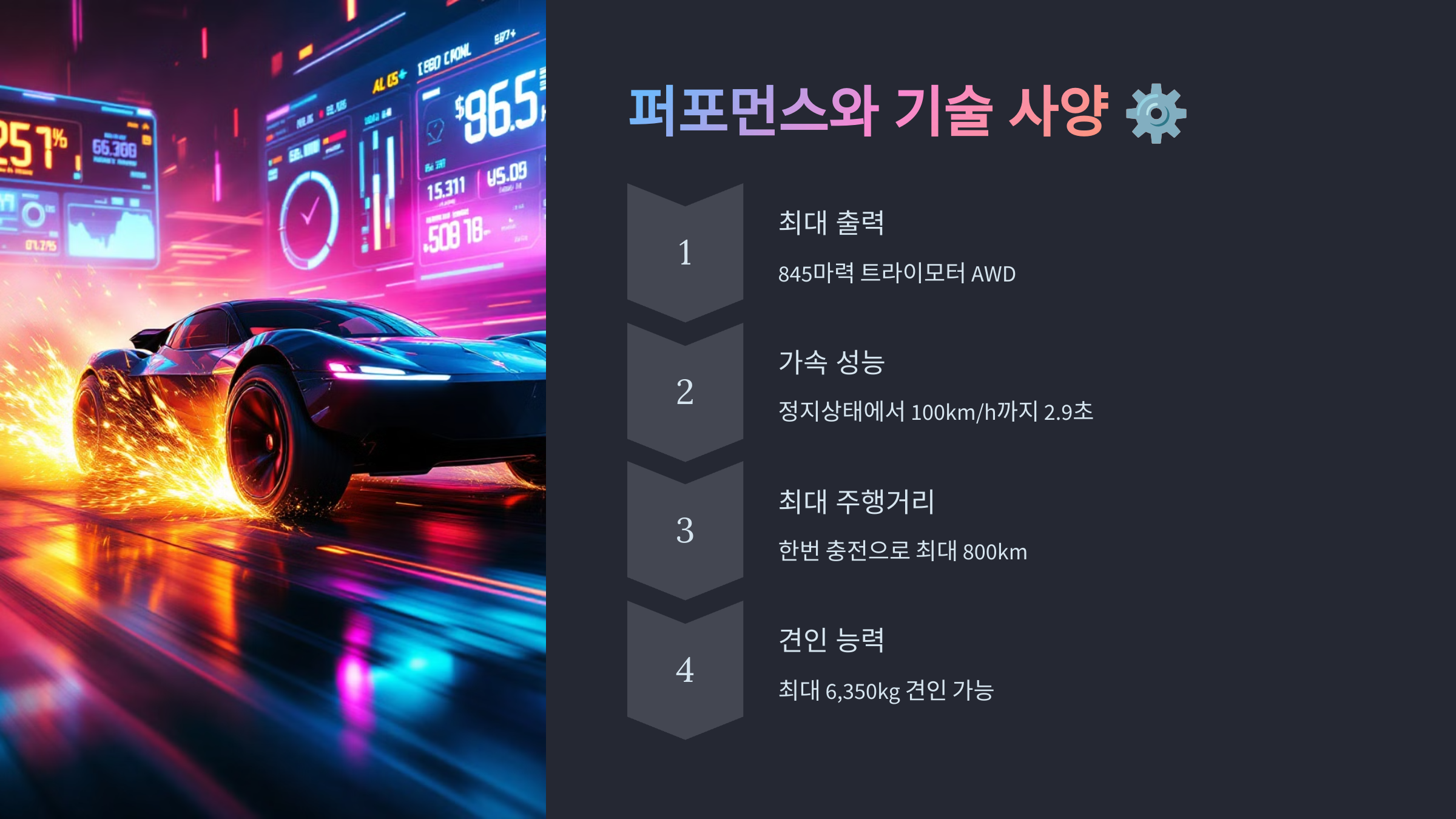 사이버트럭은 외형뿐만 아니라 성능 면에서도 기존 픽업트럭들과는 차원이 다른 모습을 보여줘요. 먼저 가장 주목할 점은 바로 놀라운 가속 성능이에요. 사이버트럭은 0에서 100km/h까지 도달하는 데 단 2.9초밖에 걸리지 않아요. 이 정도면 슈퍼카 못지않은 속도죠!