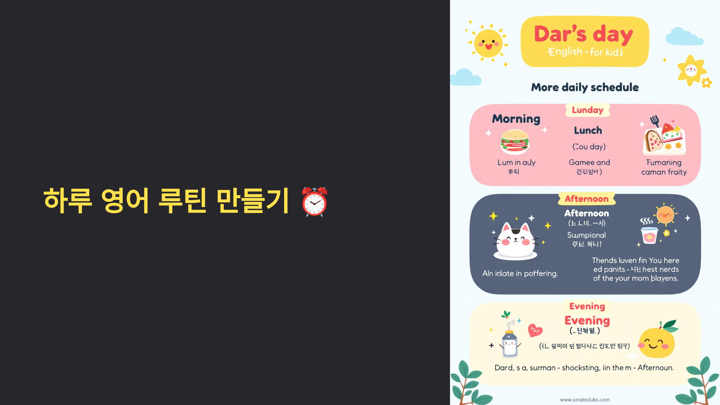 루틴은 아이의 생활 시간표에 자연스럽게 끼워 넣는 방식으로 구성해야 부담이 없어요. 예를 들어 아침, 점심, 저녁, 자기 전 등 정해진 시간에 영어를 접하면, 아이는 영어를 ‘일상’으로 받아들이게 돼요.