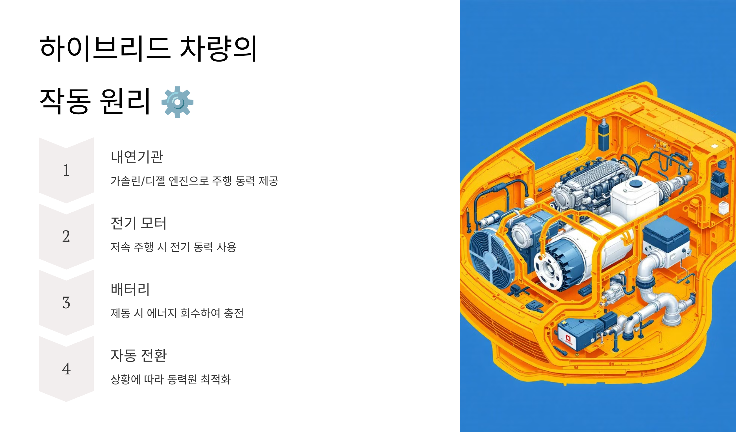 다음으로, 하이브리드 차량이 어떻게 작동하는지 기술적인 부분도 살펴봐야겠죠? ⚙️