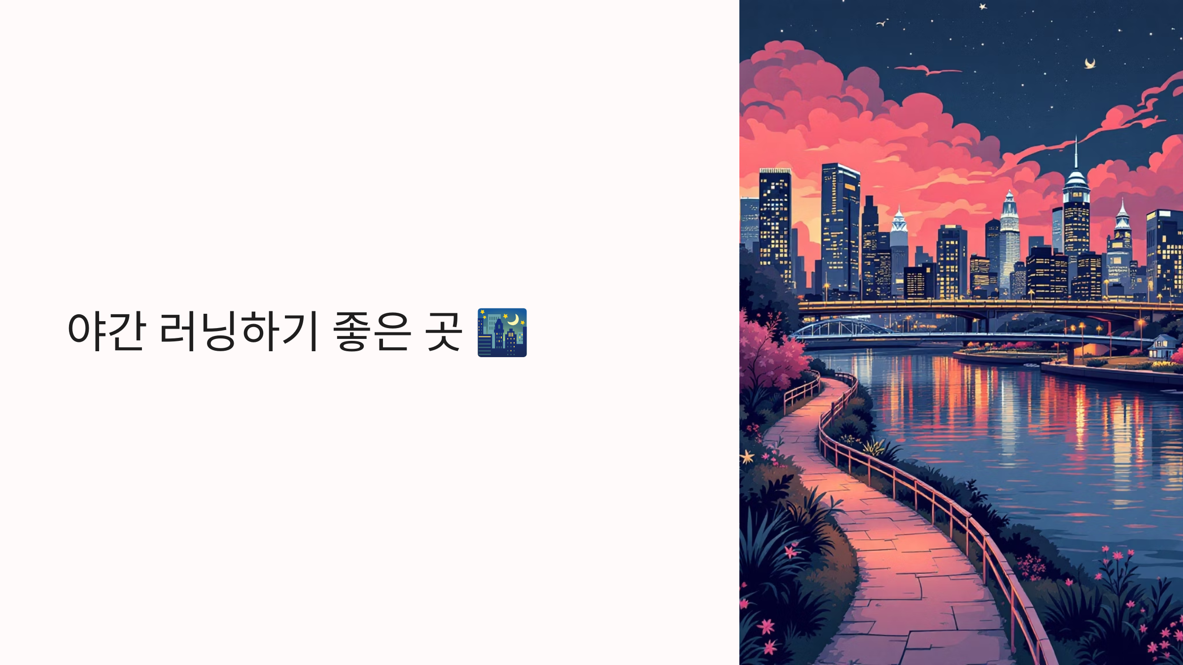 다음은 🌙 야간 러닝 스팟을 소개할게요. 조명, 안전성, 분위기까지 야간 전용 코스로 달리기 좋아요!