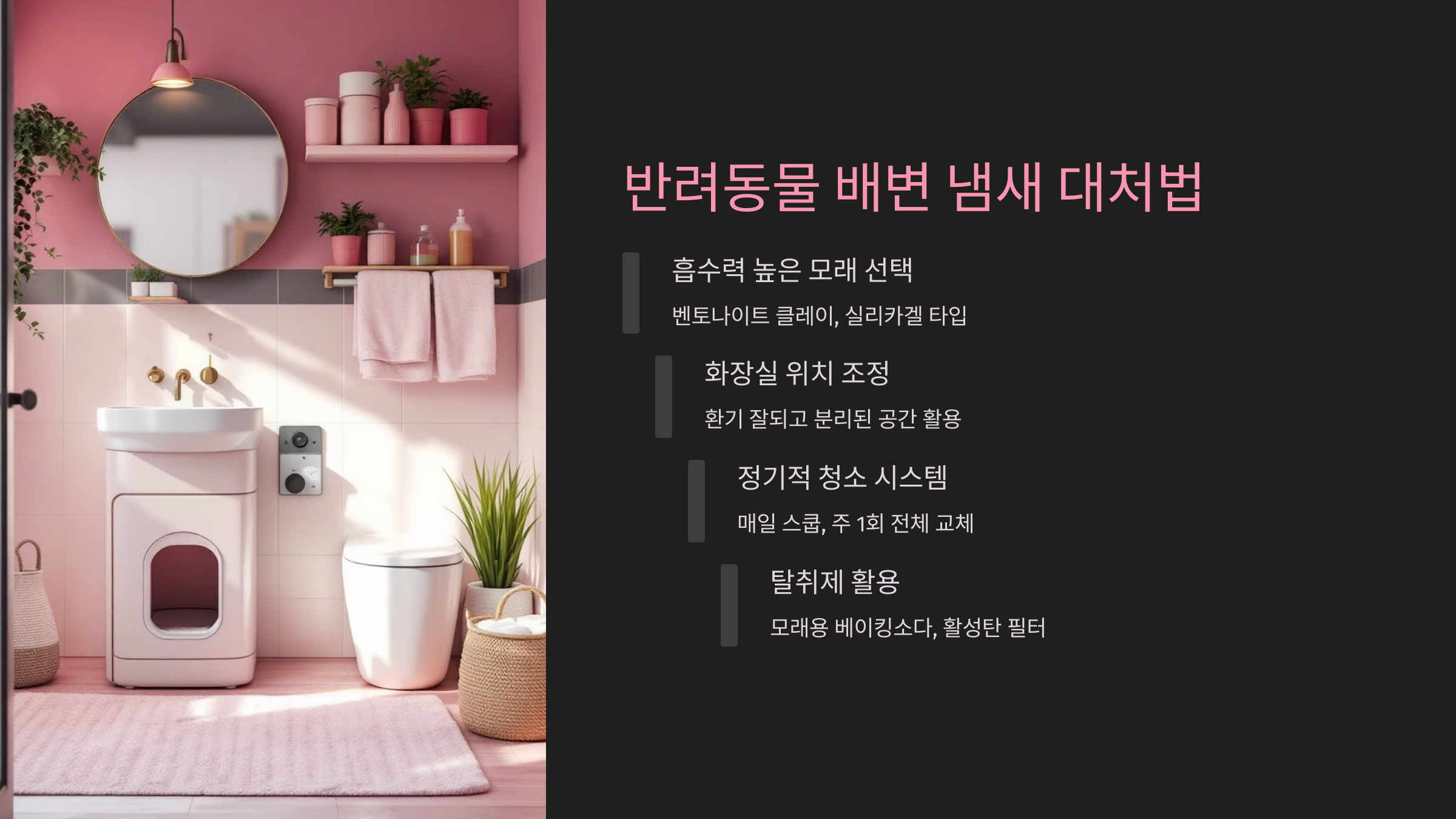 반려동물과 함께 사는 집이라면, 화장실은 사람만의 공간이 아니에요. 특히 고양이나 소형견 배변 냄새는 금방 퍼지고, 청소가 조금만 늦어져도 집 전체에 퍼질 수 있어요!