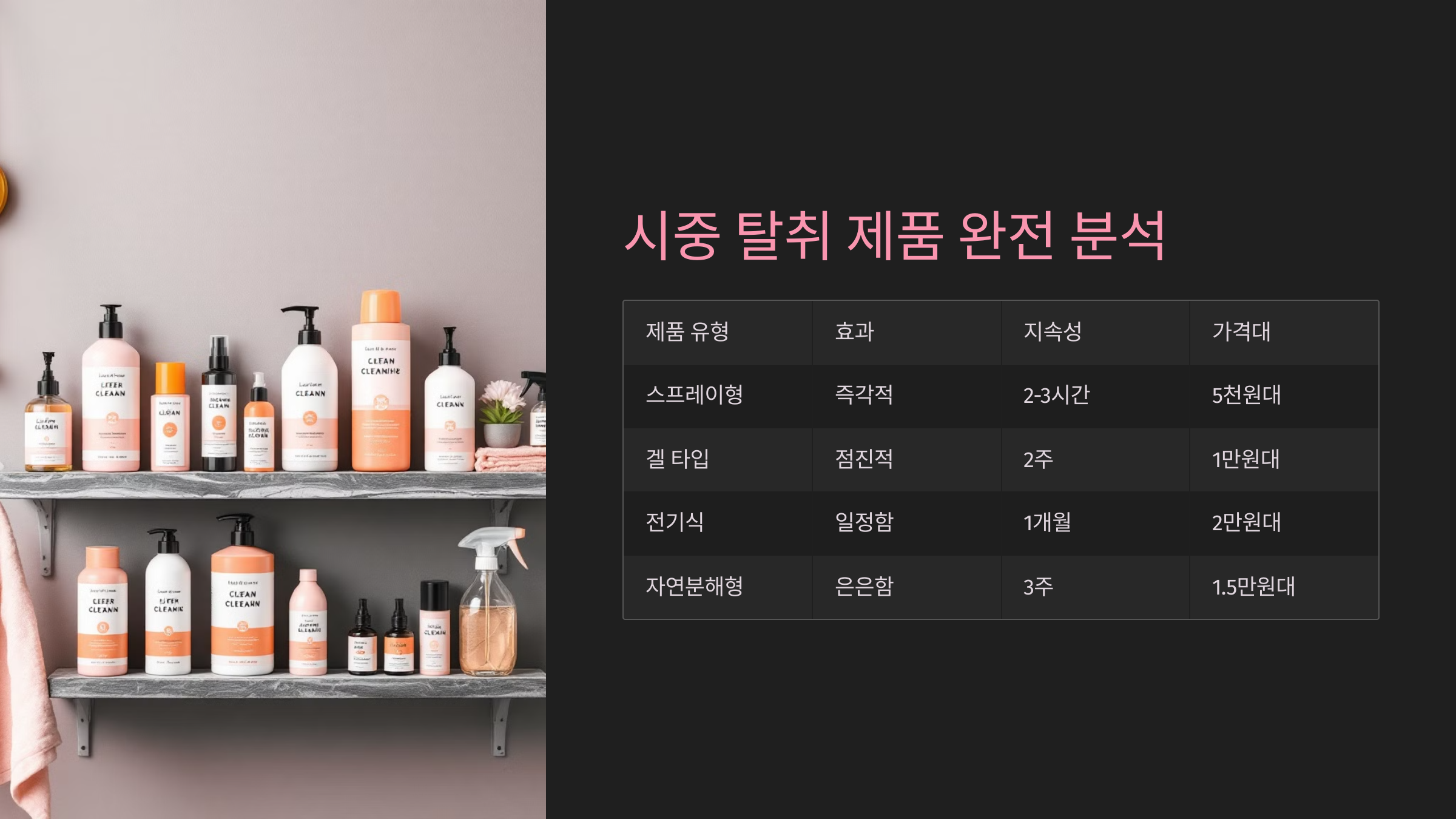 먼저 '스프레이형 탈취제'는 즉각적인 효과가 가장 뛰어나요. 악취가 날 때 바로 분사하면 냄새가 사라지는 동시에 상쾌한 향으로 바뀌죠. 다만 근본적인 제거는 아니고 일시적인 효과라 주기적인 청소와 병행해야 해요.