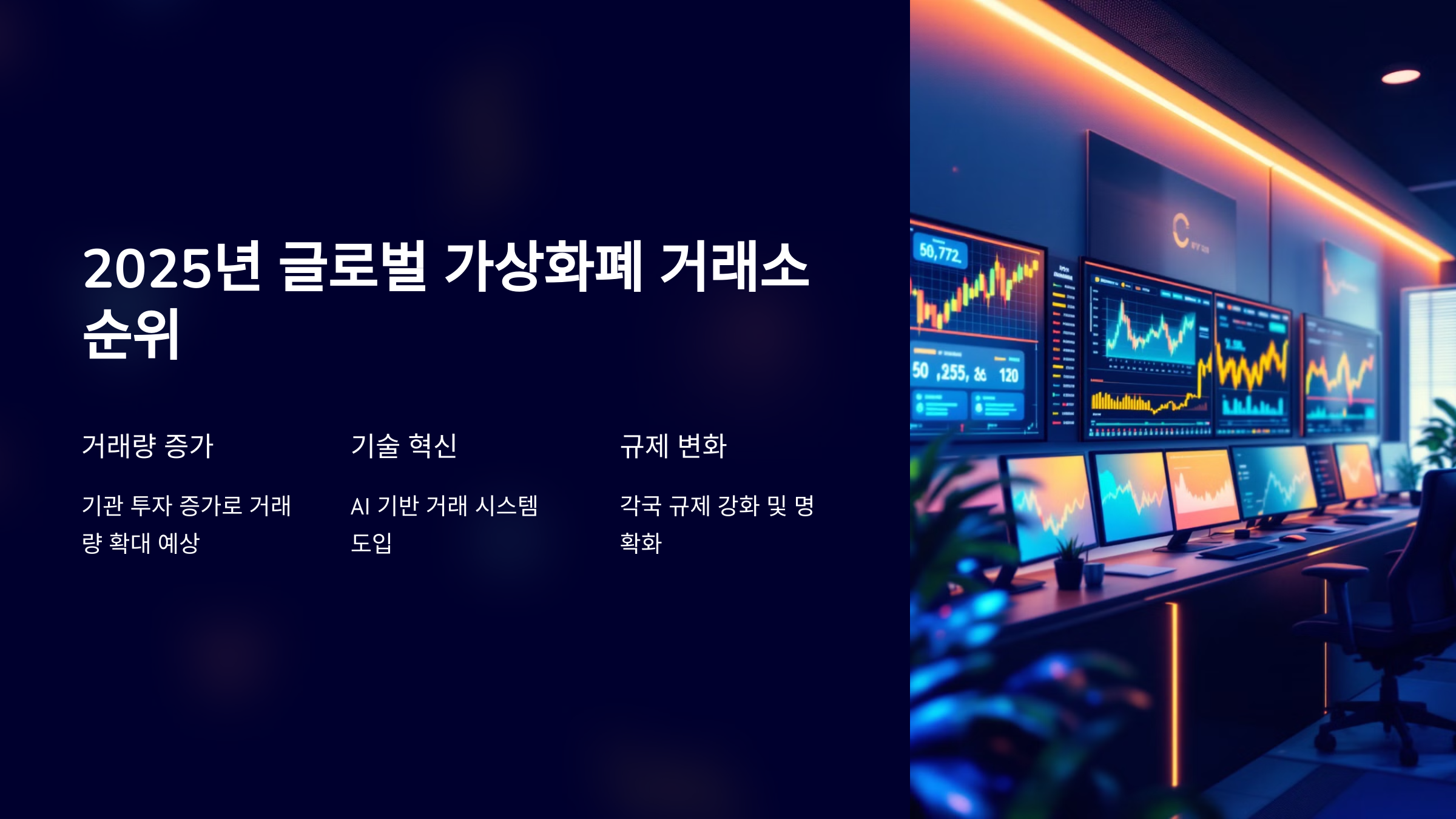 거래소를 선택할 때는 단순히 유명세만 따지는 것이 아니라 **보안성, 신뢰도, 거래량, 수수료, 규제 준수 여부** 등을 꼼꼼히 살펴야 해요. 이제 **2025년 기준 글로벌 가상화폐 거래소 순위**를 알아볼까요? 📊