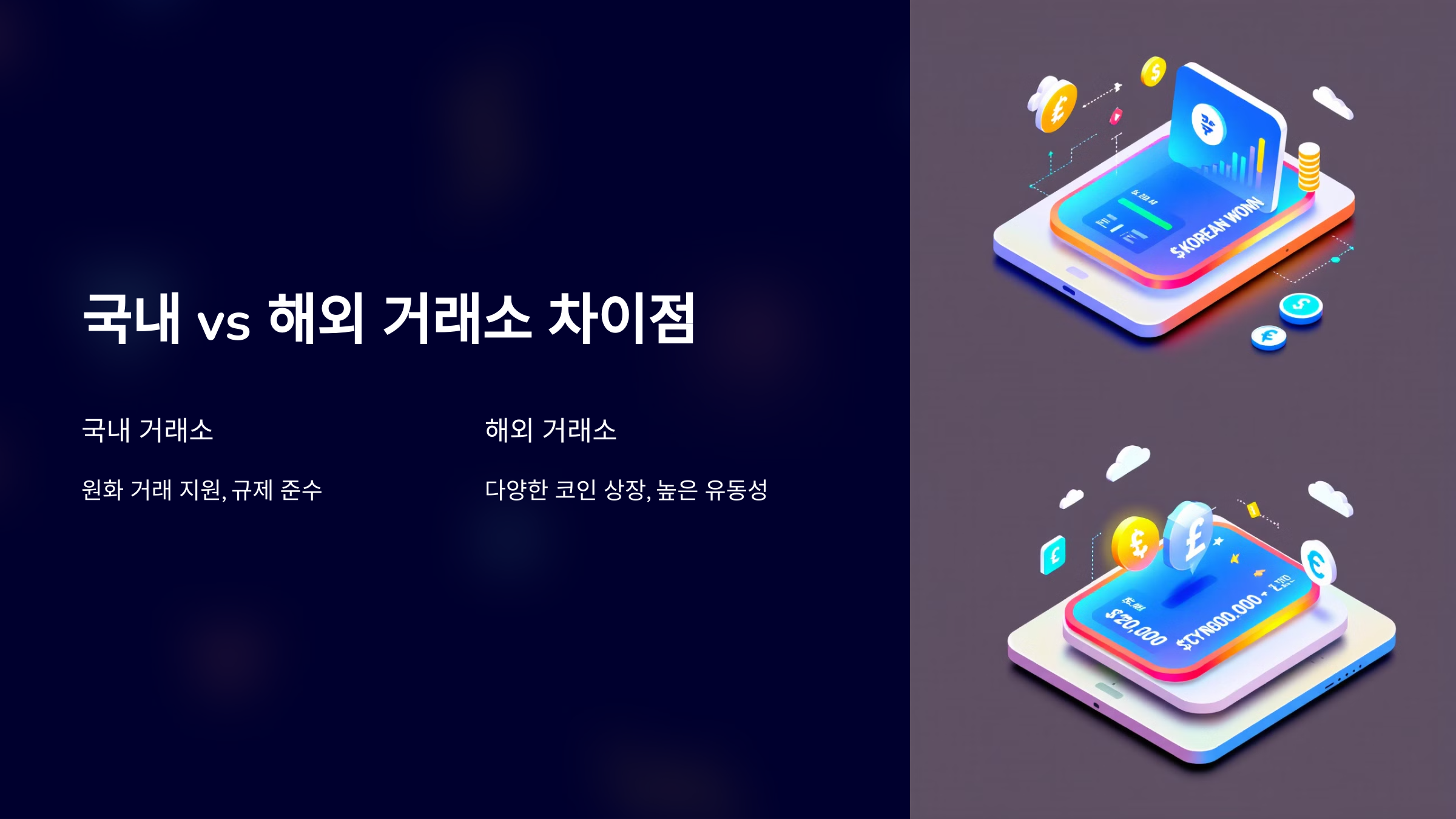 그럼 **국내 거래소와 해외 거래소의 차이점**도 알아볼까요? 🌍