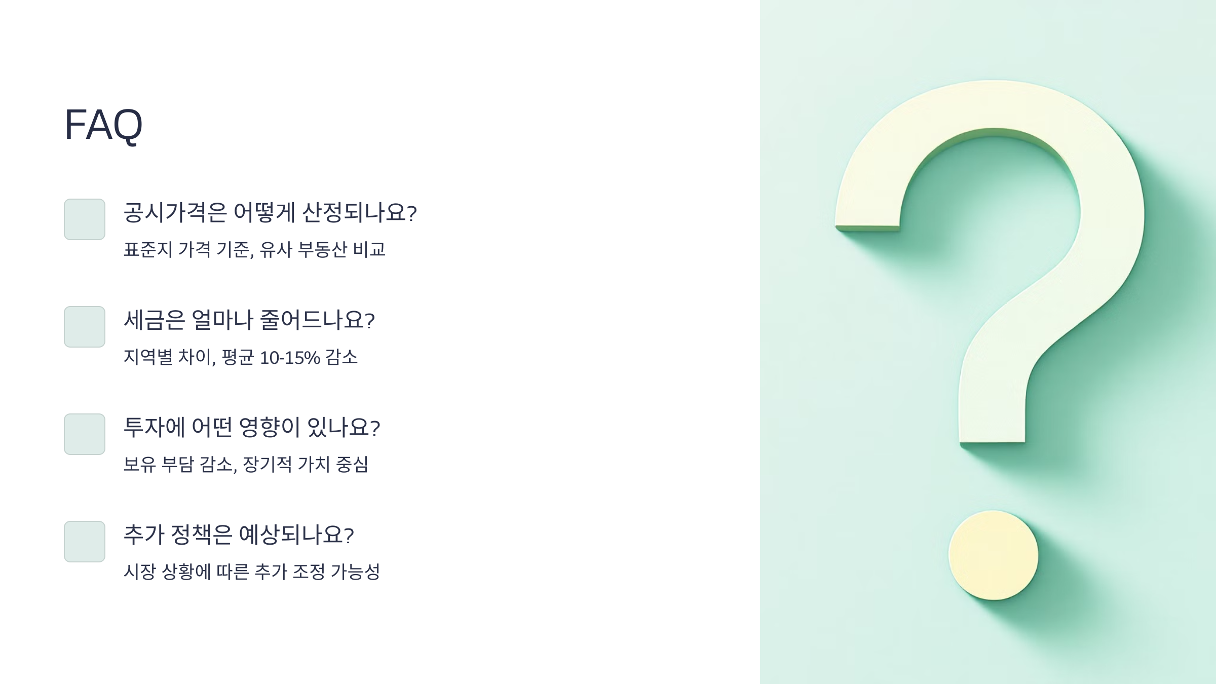 공시가격 인하 정책은 단기적으로 시장 안정화와 세부담 완화라는 긍정적인 효과를 가져왔어요. 그러나 장기적으로는 여전히 다양한 변수들이 존재해요. 특히 금리 인하 가능성, 경기 회복 여부, 정부의 추가 부동산 정책 등도 함께 살펴봐야 해요.