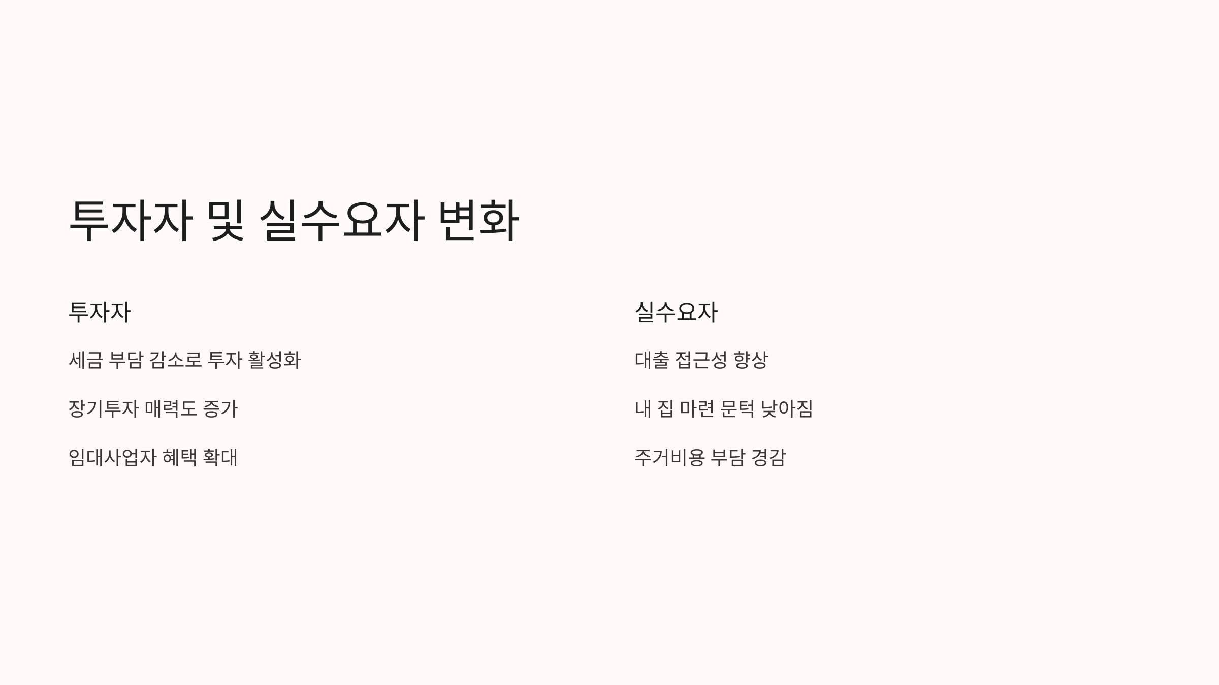 | 임차인 | 전월세 매물 증가로 선택 폭 확대 | 일부 지역 월세 상승 가능 |