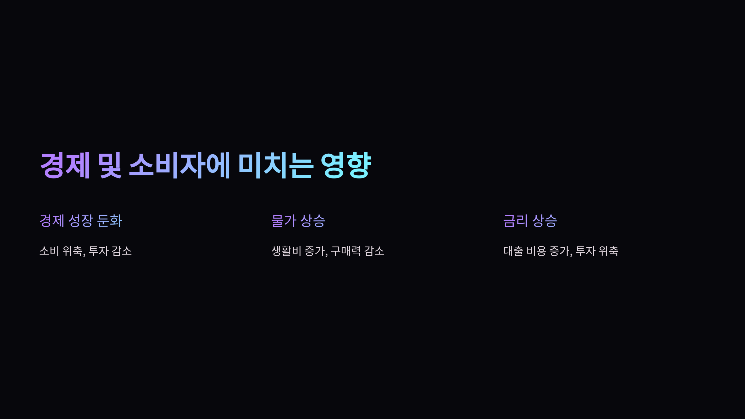 | 소비 둔화 | 비필수 소비 감소 | 소매·외식·여행 산업 타격 |