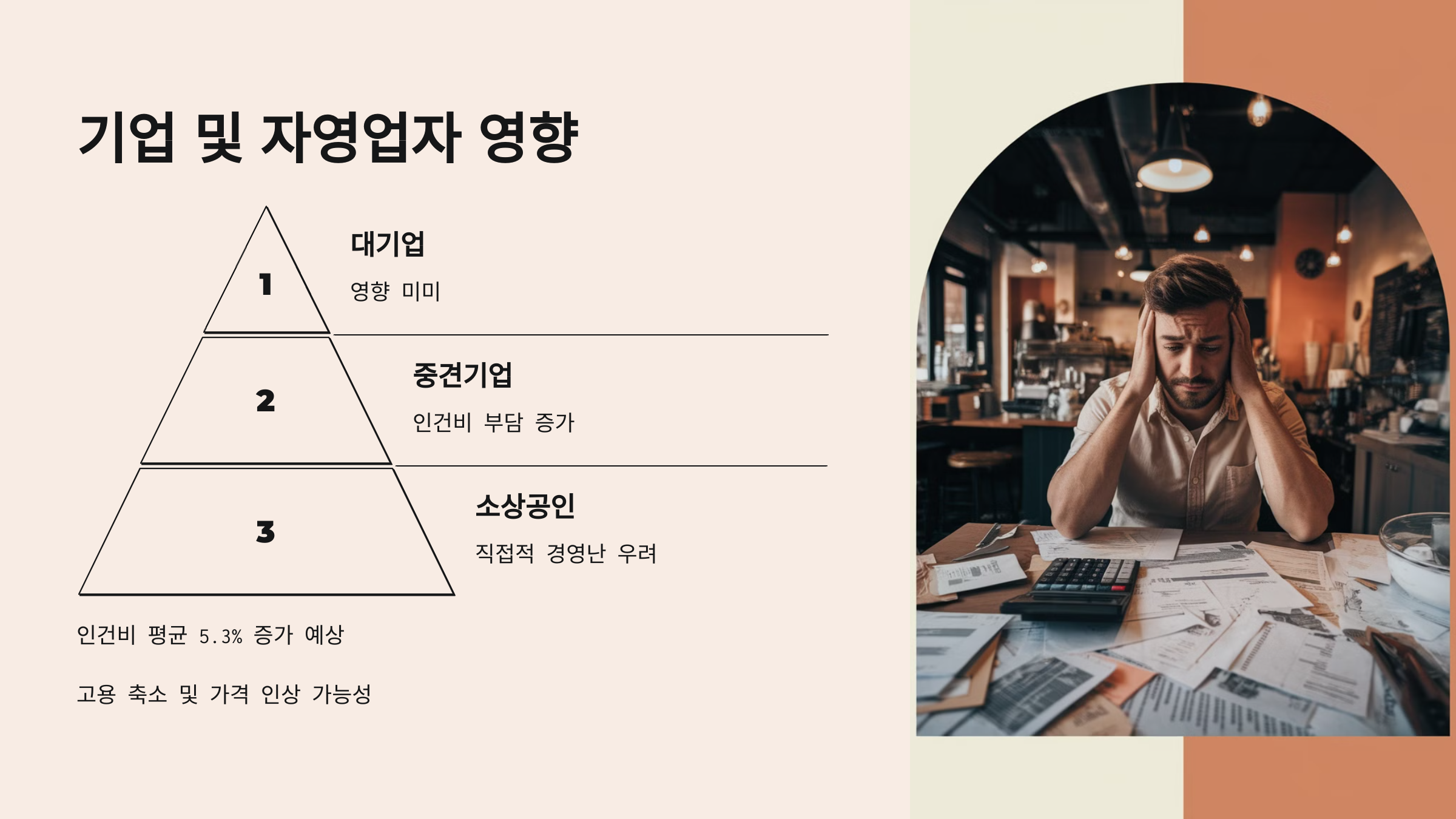 2️⃣ 자영업자 매출 감소 가능성: 인건비 상승이 제품 가격에 반영되면서 소비가 줄어들 가능성이 있어요.