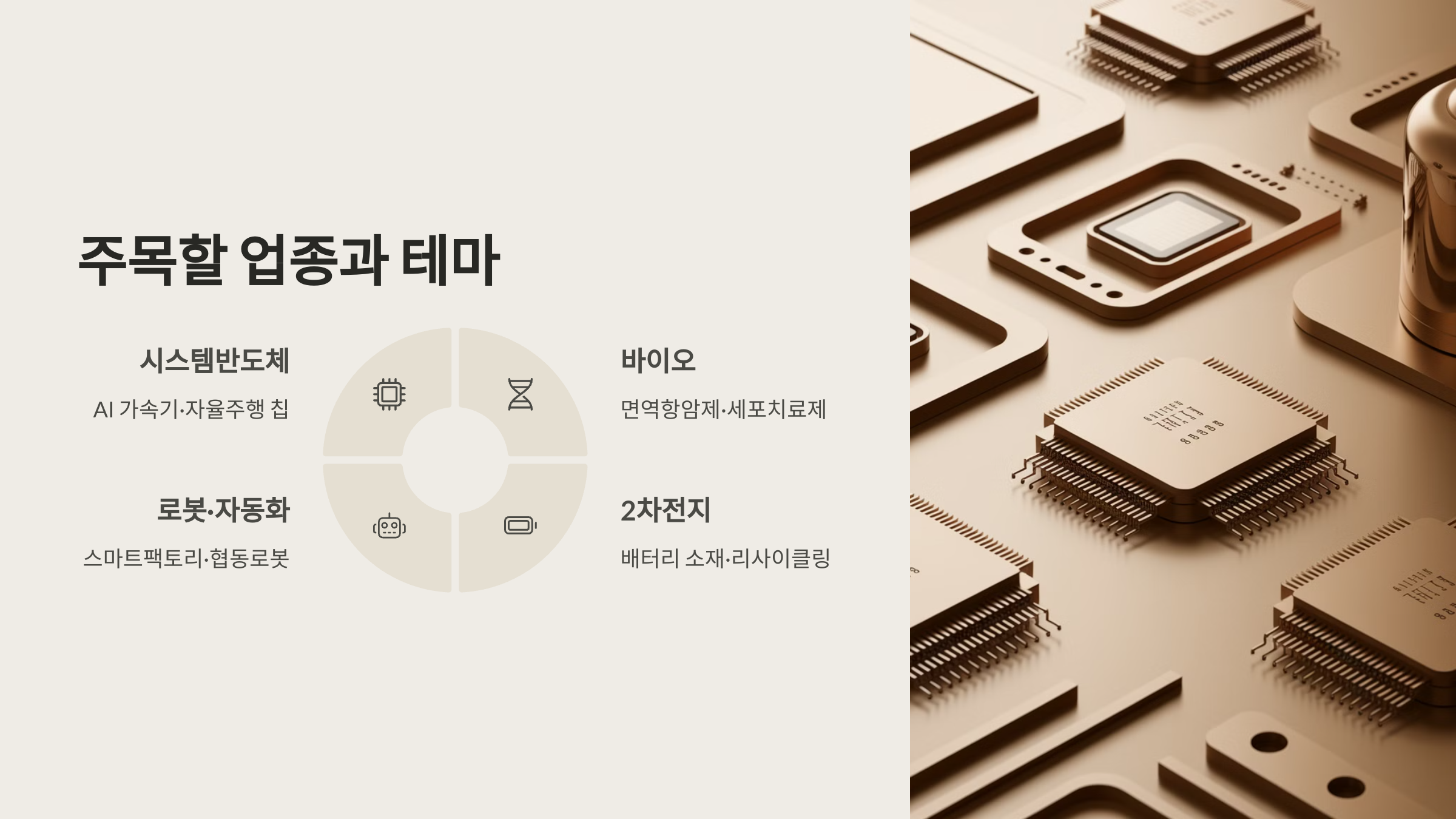 A2. AI 반도체, 바이오 신약개발, 2차전지 소재, 로봇 자동화, K-콘텐츠 관련 업종이 주목받고 있어요.