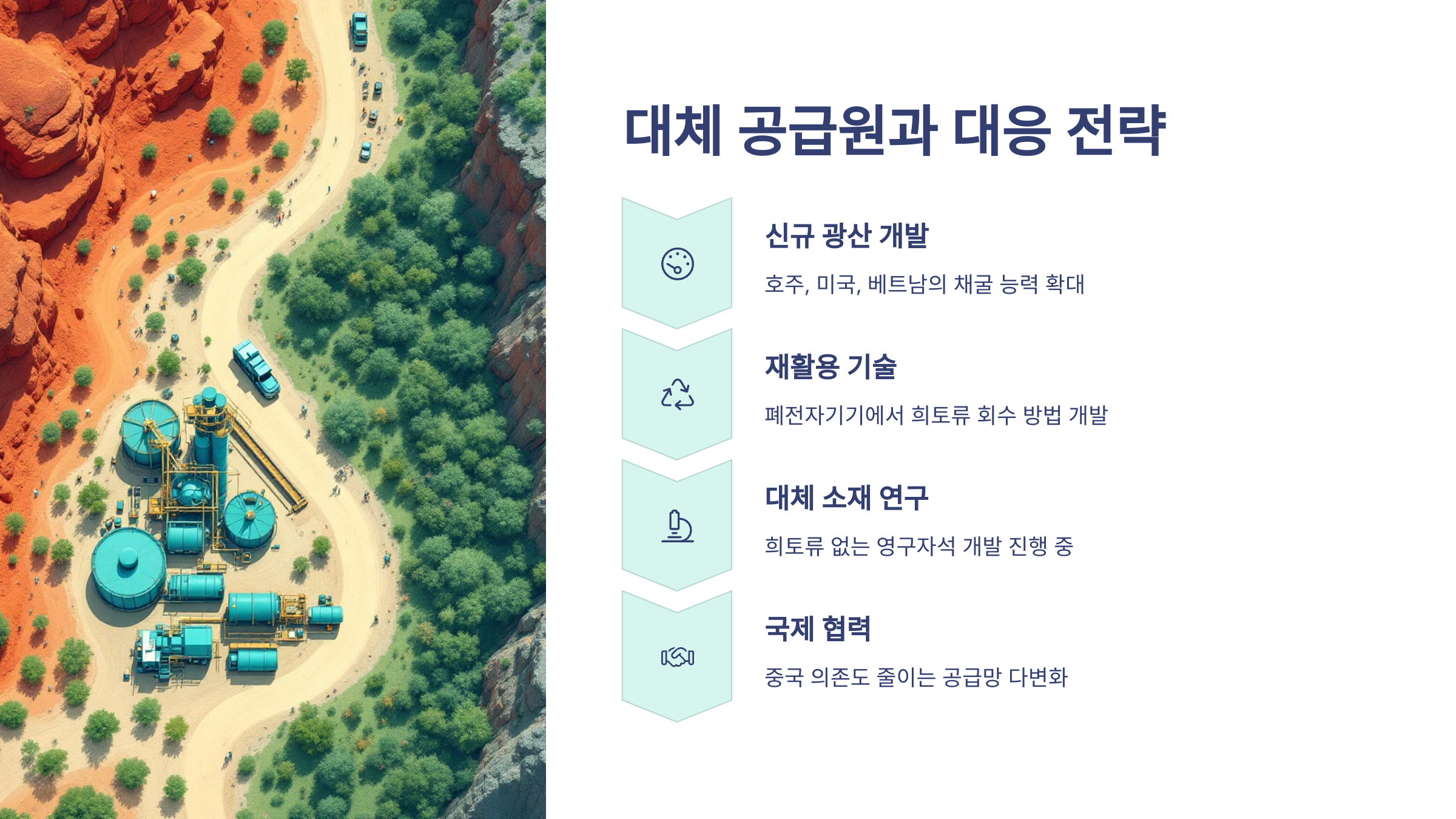 중국 의존도를 줄이기 위해 각국은 희토류 공급망 다변화를 적극 추진하고 있어요. 미국, 호주, 캐나다를 비롯해 아프리카 국가들도 새로운 희토류 개발 프로젝트에 나서고 있어요.