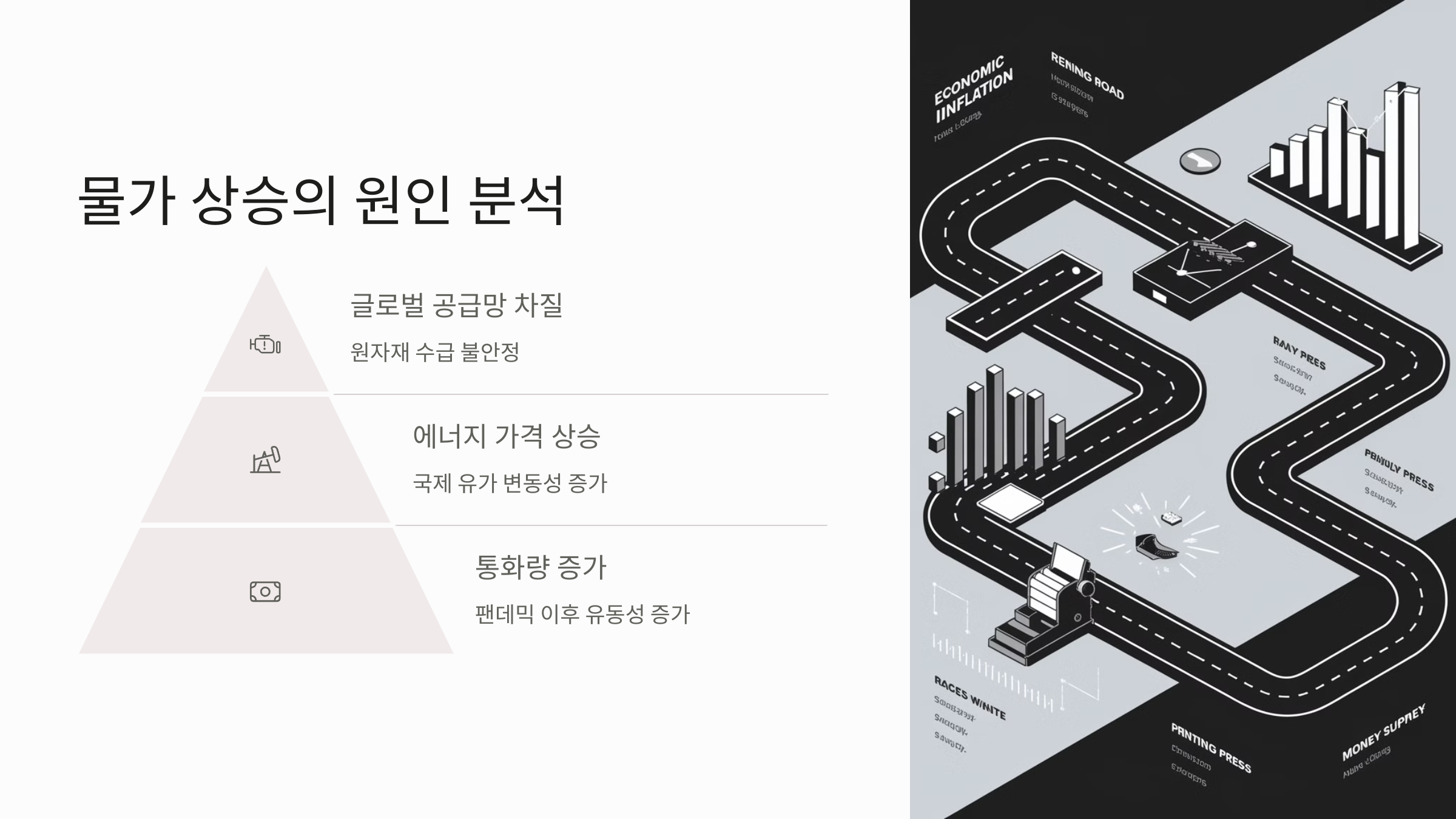 마지막으로는 **공급망의 구조적 문제**예요. 글로벌 공급망은 회복 중이지만 여전히 병목 현상이 존재해요. 특히 반도체, 원재료, 수입 농산물 등 일부 항목은 물류비와 통관 비용 상승으로 인해 가격이 오르고 있어요.