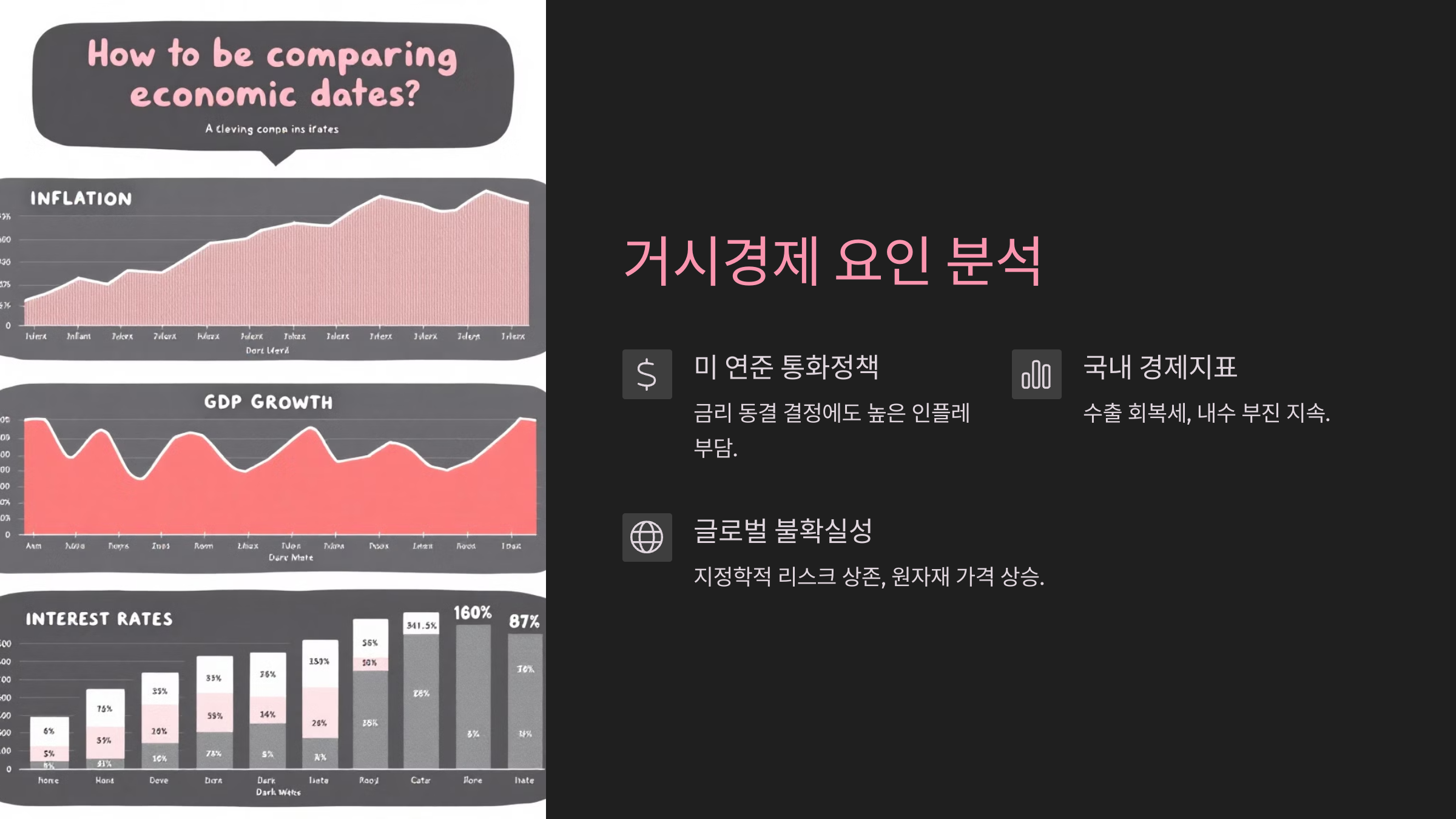 다음은 이런 흐름에 영향을 미치는 핵심 배경, 즉 ‘거시경제 요인’에 대해 살펴볼게요. 금리, 물가, 환율 등 큰 그림을 이해하면 시장 움직임도 훨씬 선명해져요. 🌍📉