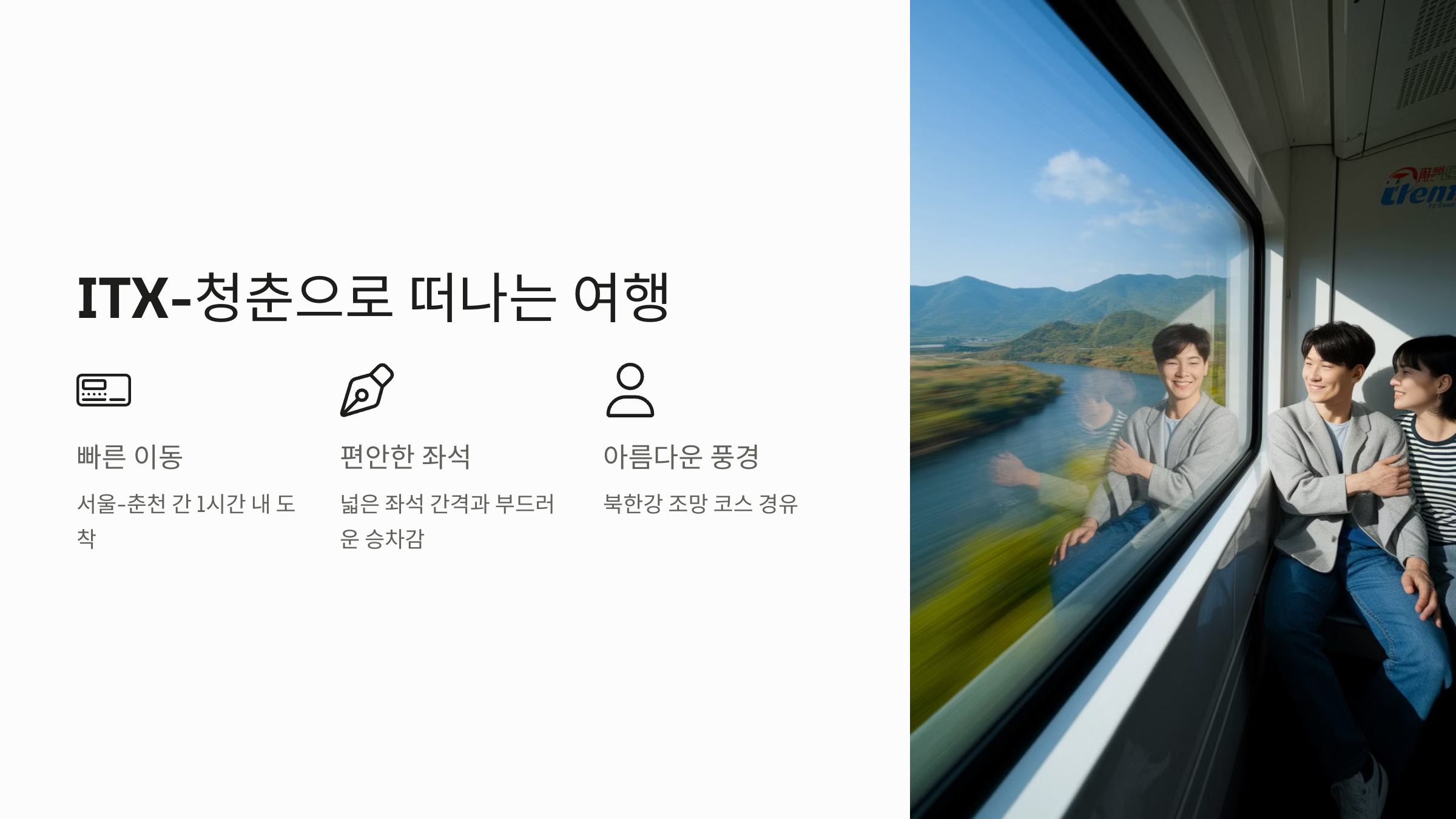 ITX-청춘은 수도권에서 춘천까지 빠르게 이동할 수 있는 기차예요. 🚆 특히 서울에서 당일치기 여행을 가기에 딱 좋아요! 자연경관이 아름다운 구간을 지나기 때문에 창밖 풍경을 감상하는 것도 큰 즐거움이랍니다. 😊