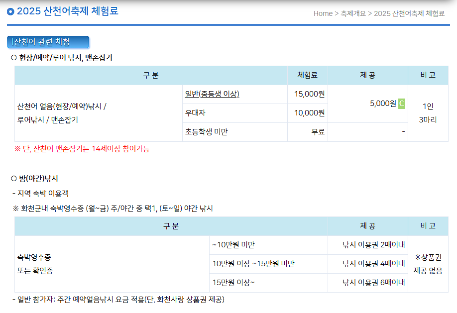 - 축제장 인근에는 화천체육공원 주차장, 하남공원 주차장, 임시 공영주차장 등 여러 주차장이 마련되어 있습니다.