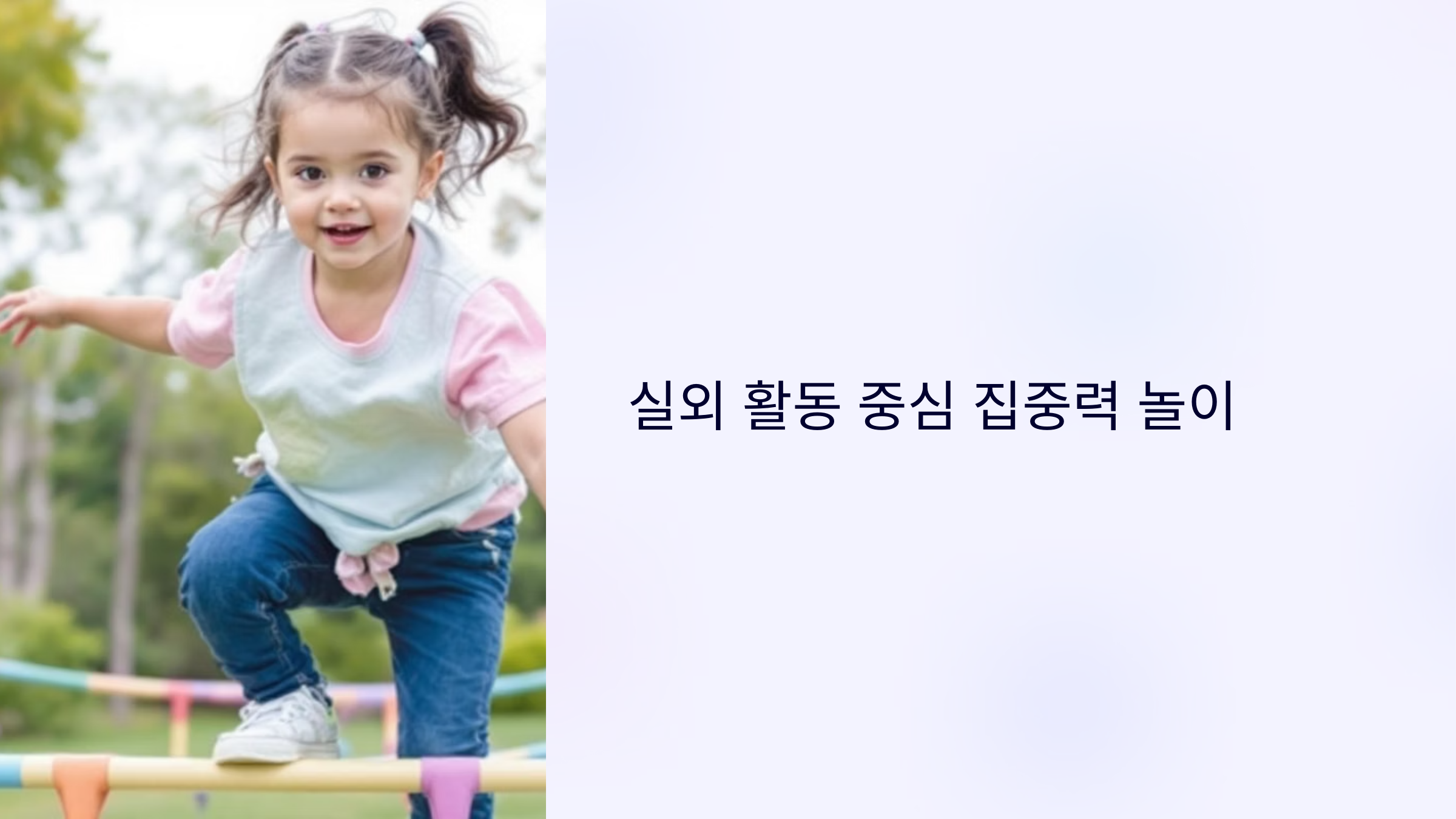 이제 [실외 활동 중심 집중력 놀이]로 이어져요! 몸을 움직이며 집중력을 길러보는 시간이에요! 🏃♀️